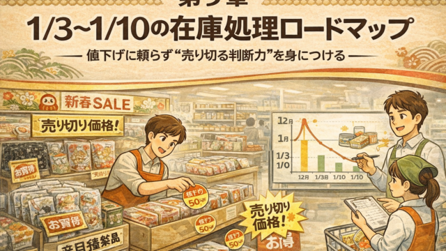これで完璧! クリスマス~年末年始商戦 第9章:1/3〜1/10の在庫処理ロードマップ練り物・餅・菓子を“利益を残して”売り切る方法 mixber.ms@gmail.com 値下げは「処分」ではなく、売上を作る“最後の仕事” 1月3日。店内が一気に静かになり、年末の熱気が嘘のように消える。 …